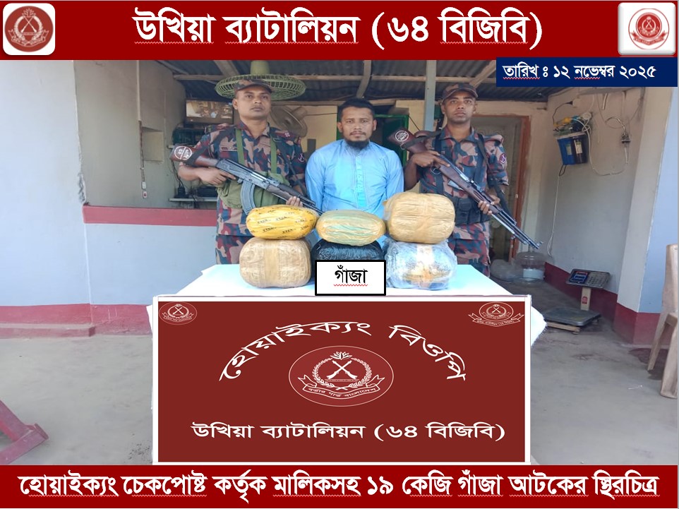 কক্সবাজারের উখিয়ায় বর্ডার গার্ড বাংলাদেশ (বিজিবি)-এর দুঃসাহসিক অভিযানে ১৯ কেজি গাঁজাসহ এক মাদক পাচারকারীকে গ্রেপ্তার করেছে ৬৪ ব্যাটালিয়নের সদস্যরা।