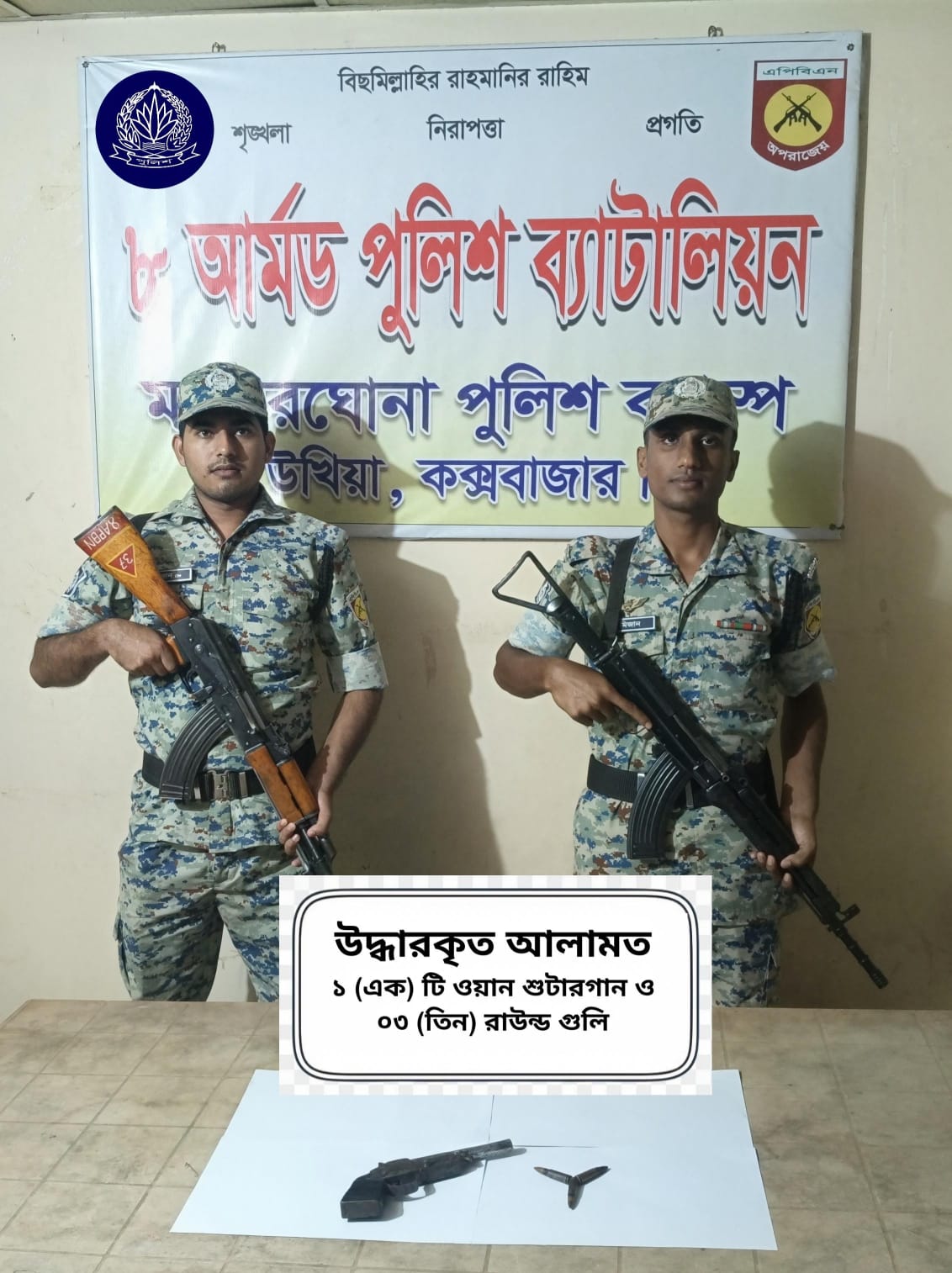 কক্সবাজারের উখিয়ায় এফডিএমএন ক্যাম্প-১৮ এর এল/০৯ ব্লকস্থ ব্রীজের পাশের রাস্তা থেকে পরিত্যক্ত অবস্থায় একটি ওয়ান শুটারগান ও তিন রাউন্ড গুলি উদ্ধার করেছে ৮ আর্মড পুলিশ ব্যাটালিয়ন (এপিবিএন)।
